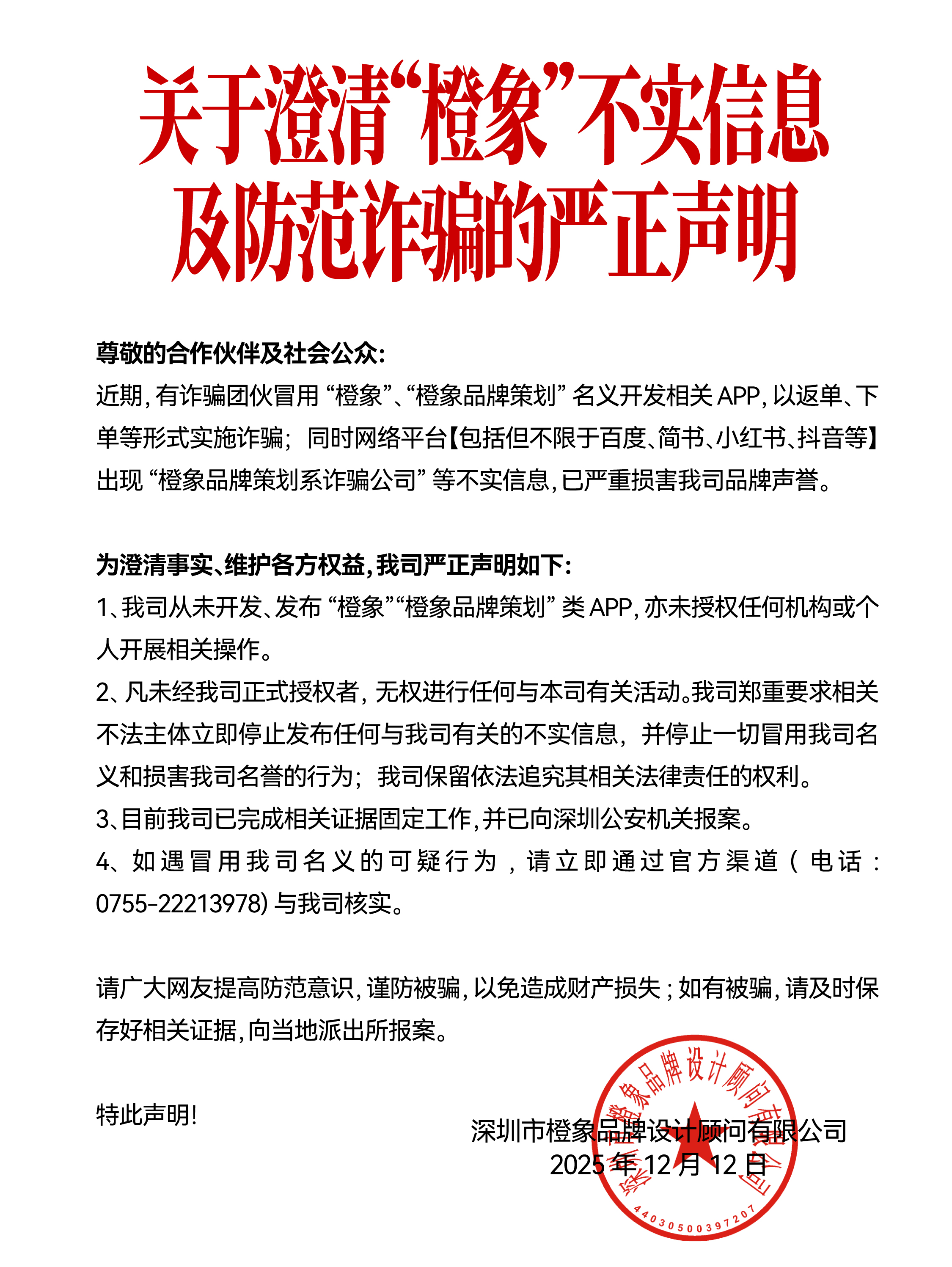 近期,有诈骗团伙冒用 “橙象”、“橙象品牌策划” 名义开发相关 APP,以返单、下单等形式实施诈骗;同时网络平台【包括但不限于百度、简书、小红书、抖音等】出现 “橙象品牌策划系诈骗公司” 等不实信息,已严重损害我司品牌声誉。